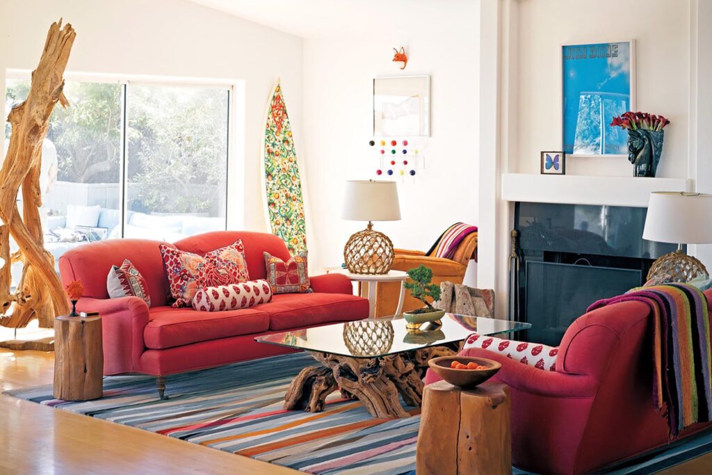 Cesur ve renkli duvarlar, tek renk yerine birden fazla tonun bir arada kullanılmasını sağlıyor. Bununla birlikte, farklı desenlerde mobilyalar, renkli koltuklar ve retro desenli halılarla tamamlanıyor. Eğlenceli sanat eserleri ve duvar kağıtları, pop-art tablolar ve soyut duvar tasarımları ile odaları canlandırıyor.